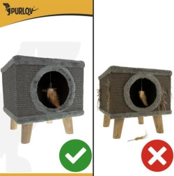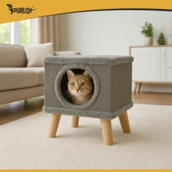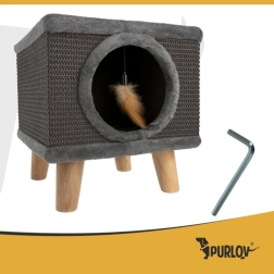 Stylový kočičí domek PURLOV kombinuje pelíšek a škrabadlo v jednom. Díky stabilní konstrukci na dřevěných nožkách, povrchu ze sisalu a měkkému plyši nabízí bezpečné místo pro odpočinek, hraní i broušení drápků — a vaše nábytek zůstane v bezpečí.