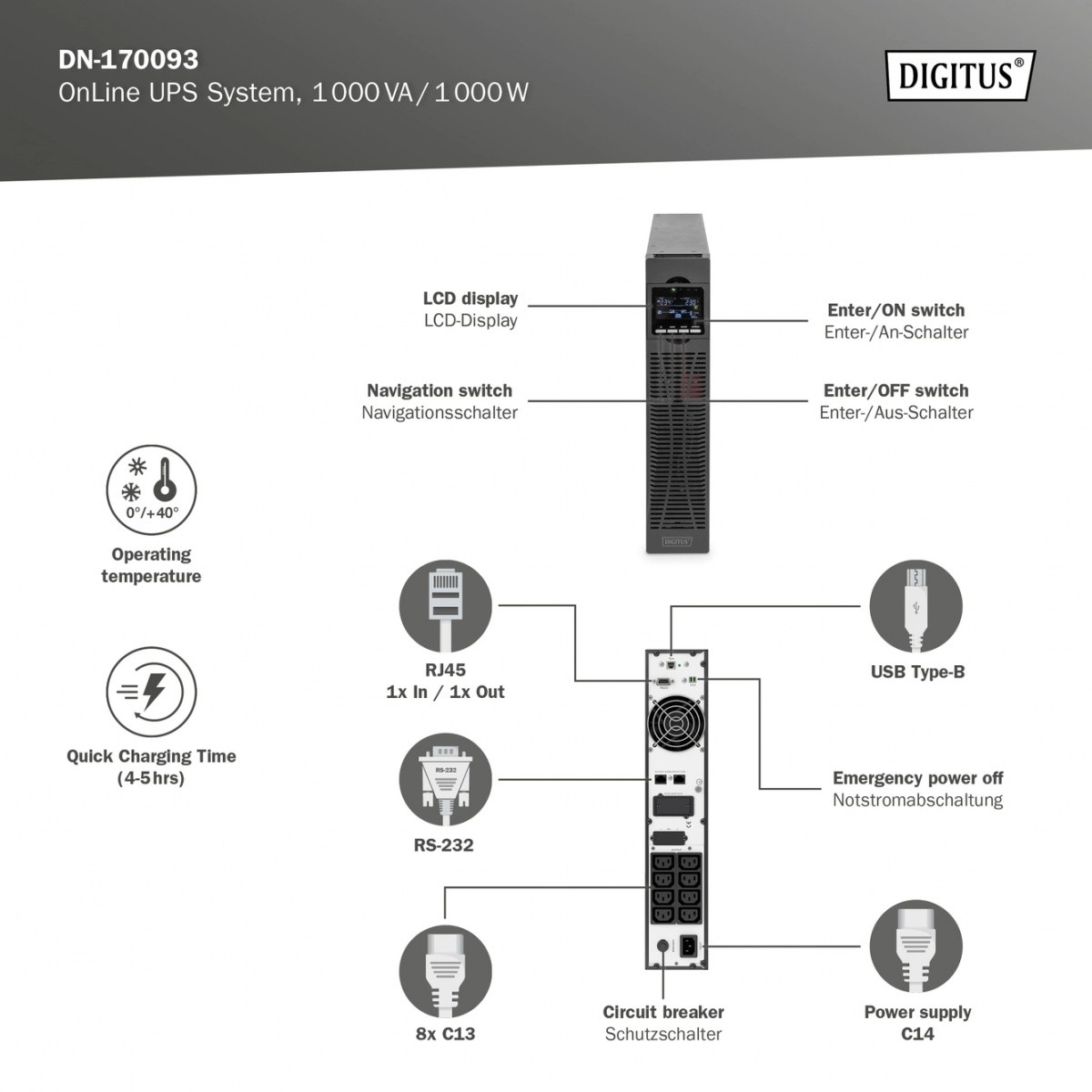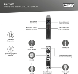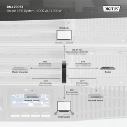 Profesionální UPS On-Line od DIGITUS je navržena pro nepřetržitou ochranu serverů, síťových prvků a pracovních stanic. Dvojitá konverze s řízením mikroprocesorem zajišťuje čistou sinusovku a stabilní napětí bez přepnutí, takže chrání data i hardware při výpadcích, podpětí či přepětí. Díky vysokému účiníku a výkonné nabíječce se hodí i do náročných firemních prostředí.