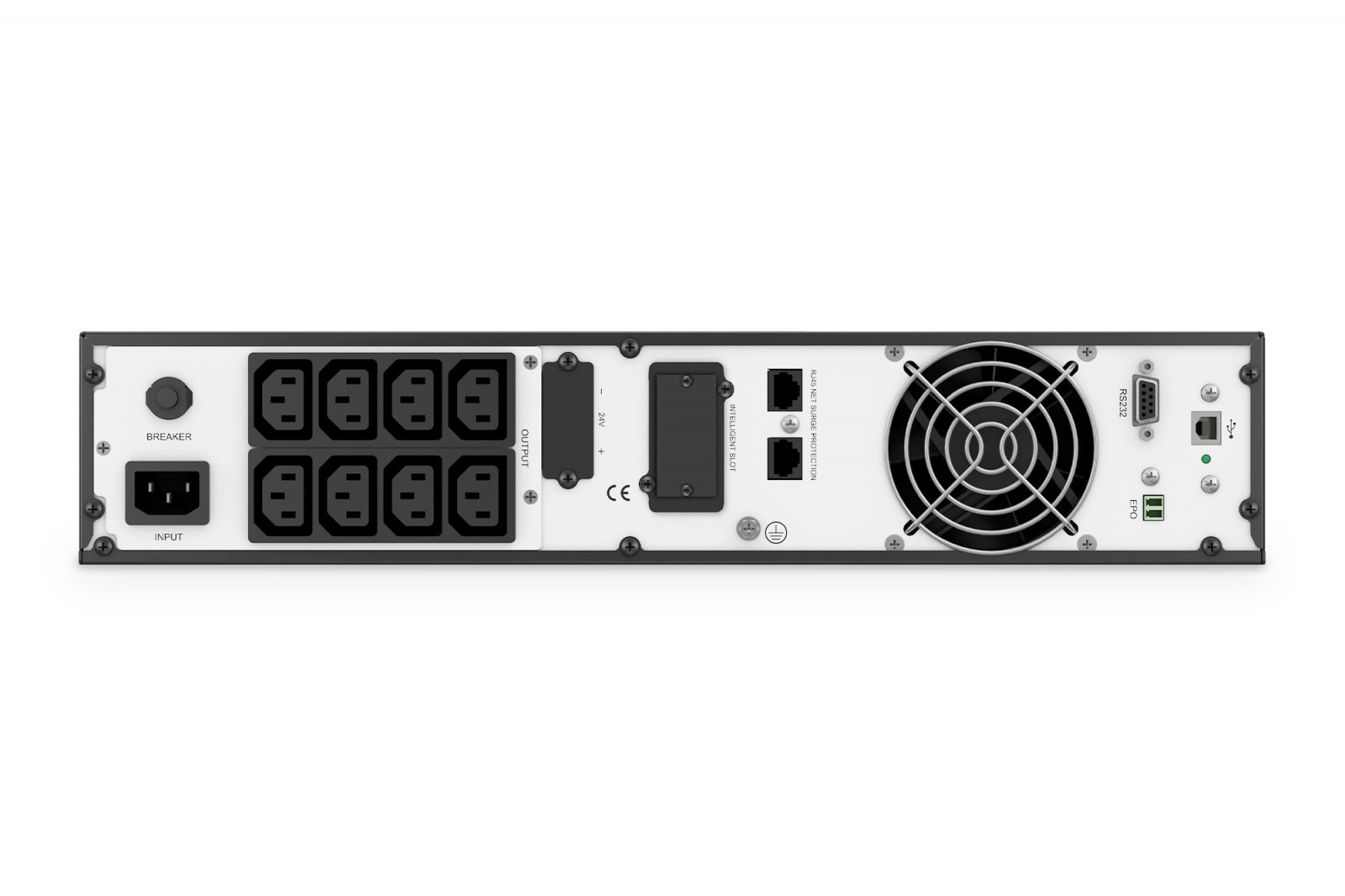 Otočný LCD displej zobrazuje stav nabíjení, baterie, režim AC, bateriový režim, bypass i chybové hlášky. Konstrukce Rack/Tower umožňuje flexibilní instalaci do 19" racku nebo samostatně. Inteligentní řízení nabíjení a otáček ventilátoru prodlužuje životnost baterií a zvyšuje spolehlivost.
