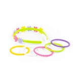 Roztomilá sada dětských doplňků pro malé parádnice od 3 let obsahuje zelenou čelenku se zdobením a pět barevných náramků. Podporuje kreativitu, jemnou motoriku a vkus při vytváření účesů a outfitů.