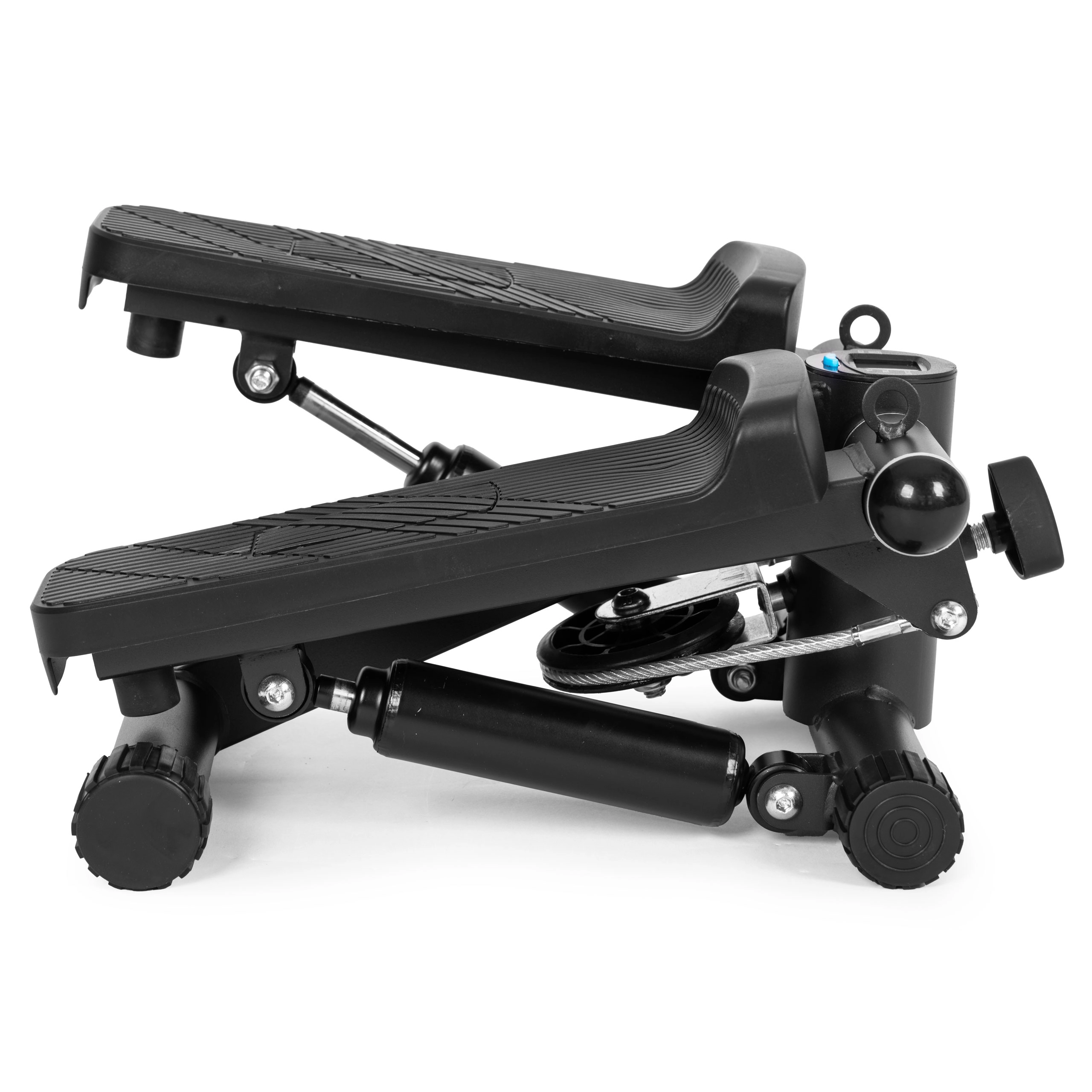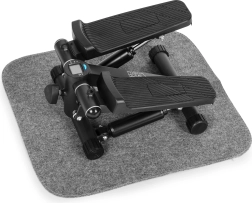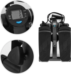 Integrovaný LCD displej (5 funkcí) přehledně ukazuje čas, kroky/min, celkový počet kroků, spálené kalorie a režim SCAN. Protiskluzové pedály a stabilizační nožky zajišťují bezpečí a komfort. Ochranná podložka z vlněné plsti tlumí vibrace, chrání podlahu a zabraňuje posunu přístroje i v menších prostorech.