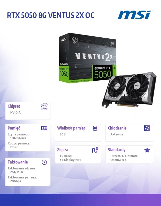 MSI GeForce RTX 5050 8GB VENTUS 2X OC je navržena pro hladký herní výkon a spolehlivost v kompaktním dvouventilátorovém provedení. Díky moderní architektuře NVIDIA Blackwell a technologii DLSS 4 získáte vyšší snímkové frekvence, ostřejší obraz a rychlejší odezvu v nejnovějších hrách.