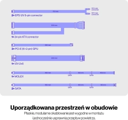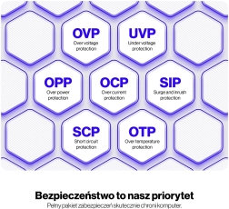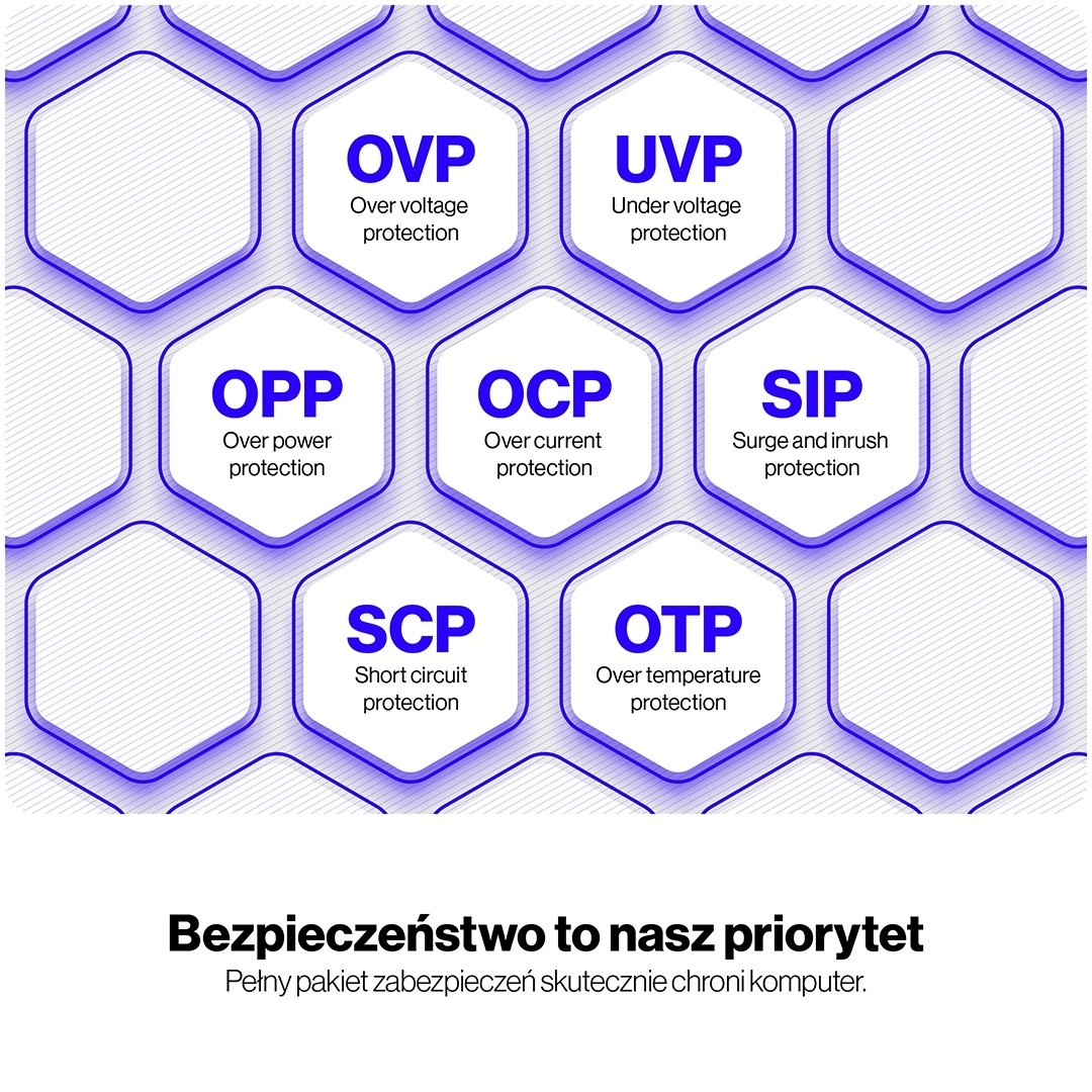 Použité japonské kondenzátory (105 °C) garantují stabilitu v náročných podmínkách. Plně modulární kabeláž zjednoduší cable management, zlepší průtok vzduchu a snižuje teploty. Balíček elektrických a tepelných ochran chrání váš PC před přetížením, přepětím, zkratem i přehřátím. Na kvalitu navazuje 10letá záruka.