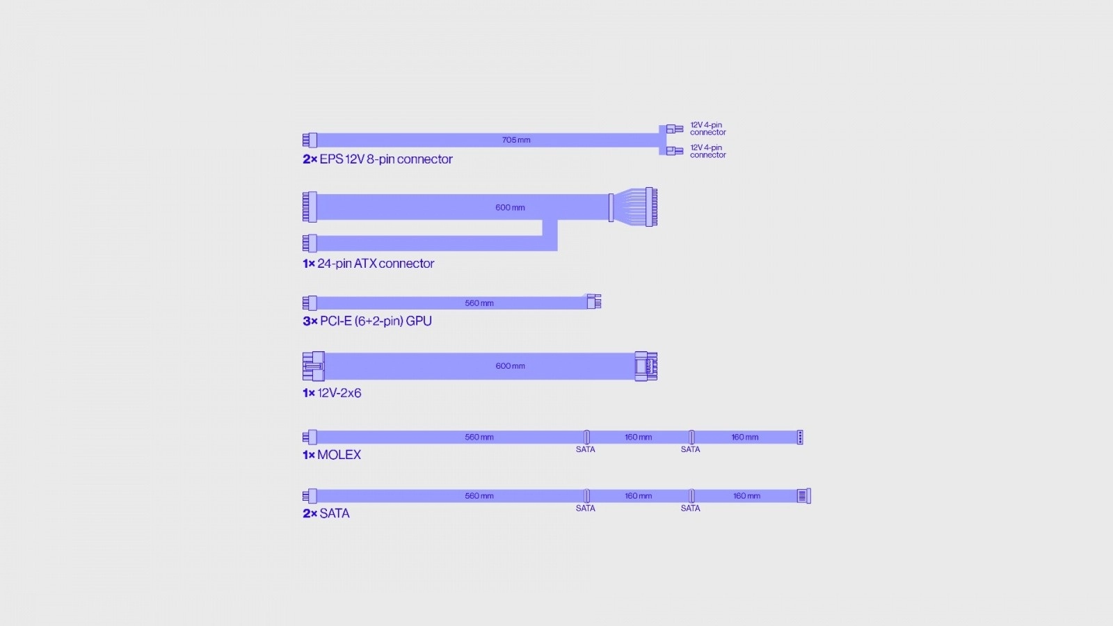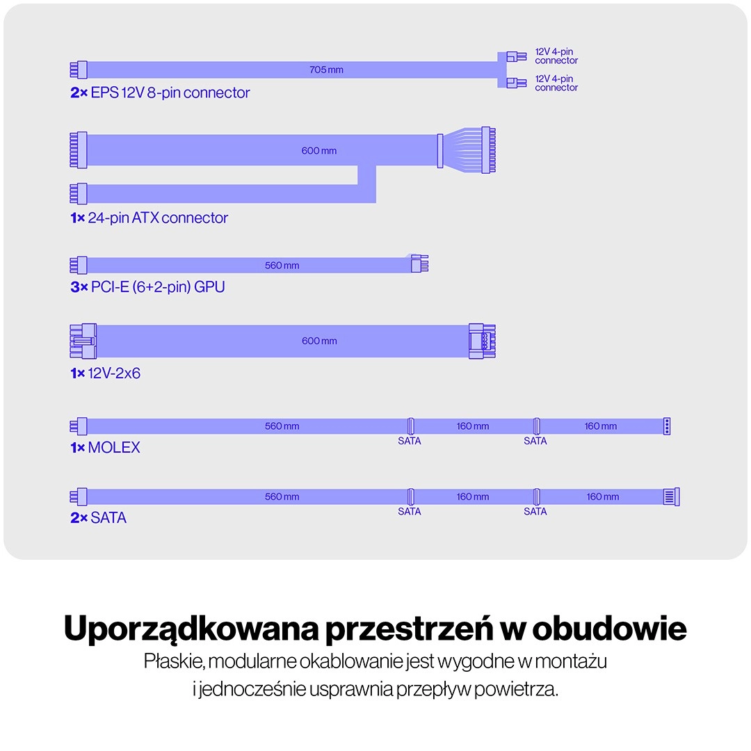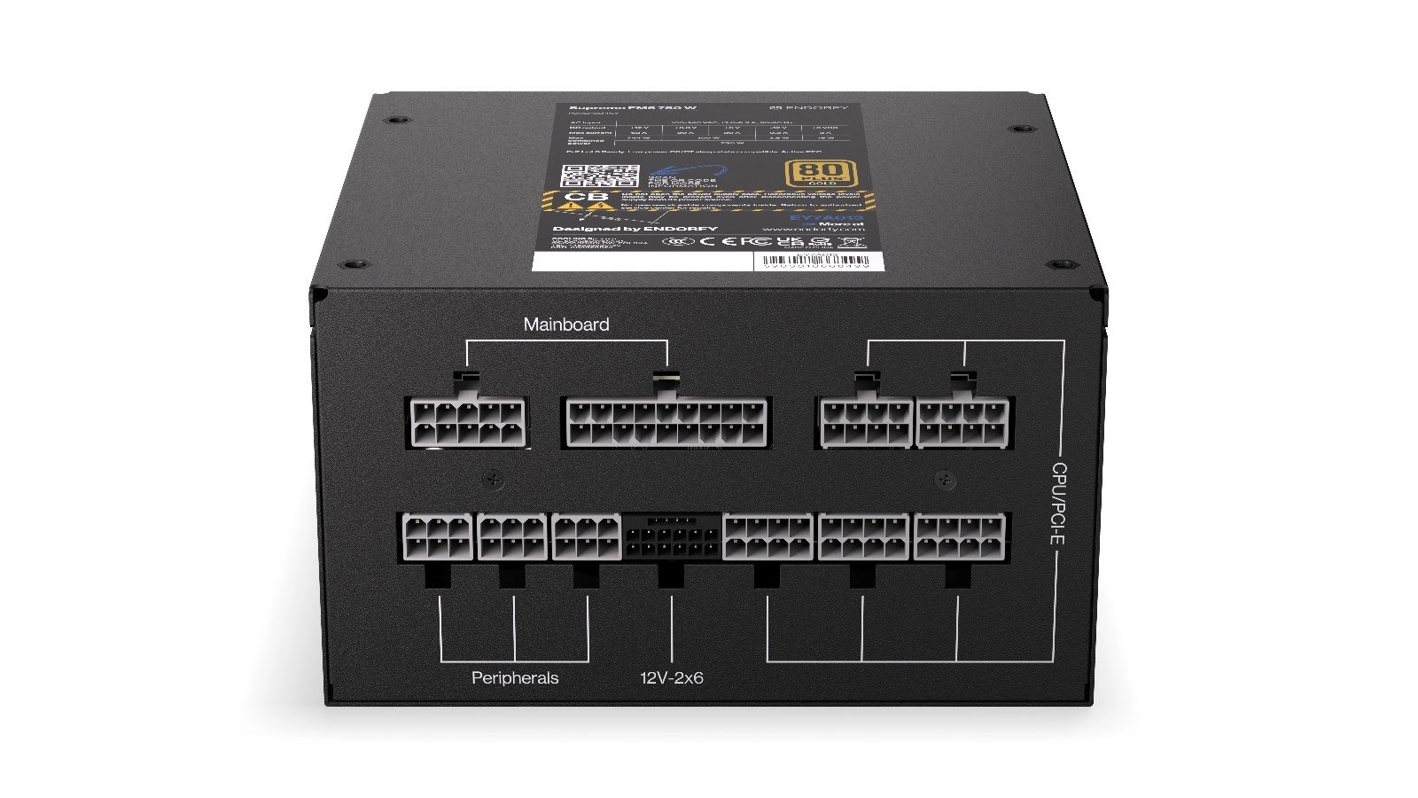 Supremo FM6 750 W splňuje novější standard ATX 3.1 a zvládá i krátkodobé špičky odběru. V balení najdete kabel 12V-2x6 pro plnou kompatibilitu s moderními GPU PCIe 5.1, nechybí ani klasické PCI-E 6+2 PIN pro tradiční grafické karty.