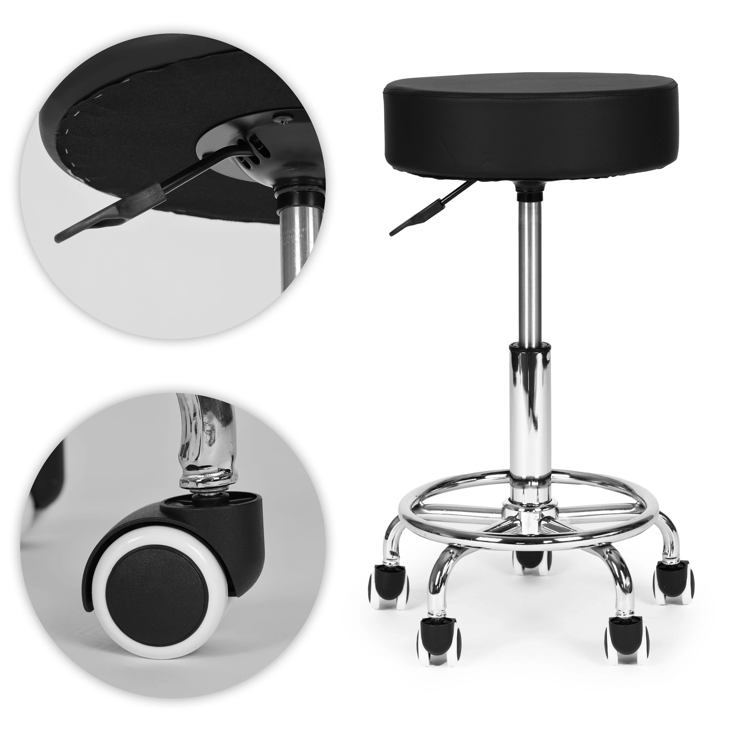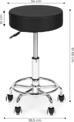 Odolné zpracování a snadná údržba – čalounění z PVC kůže je nenáročné na čištění a odolává vodě, masážním olejům i dezinfekci. Kovová (chromovaná) konstrukce se širokou pětiramennou základnou na kolečkách zaručuje stabilitu a hladký pohyb po většině podlah bez poškrábání.