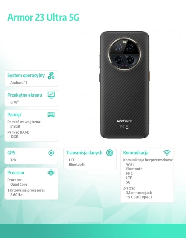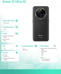 ULEFONE Armor 23 Ultra 5G je spolehlivý outdoorový telefon, který kombinuje vysoký výkon, odolnou konstrukci a pokročilý fotografický systém v elegantním černém provedení. Je navržen pro uživatele, kteří chtějí telefon, jenž zvládne práci, zábavu i dobrodružství bez kompromisů.