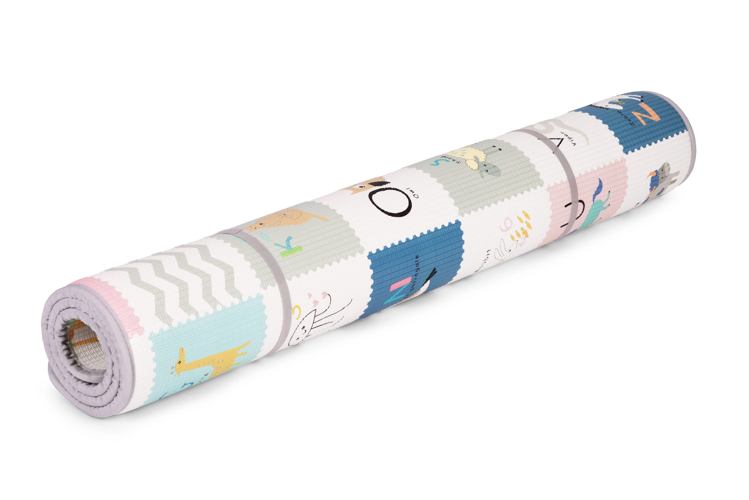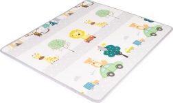 Oboustranný potisk podněcuje fantazii a učení: jedna strana nabízí veselou abecedu s obrázky a anglickými slovíčky, druhá zvířata, dopravní prostředky a přírodu. Podložku snadno srolujete a zajistíte pásky na suchý zip – ideální na úklid i přenášení do herny, k prarodičům nebo na dovolenou.