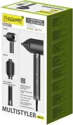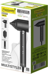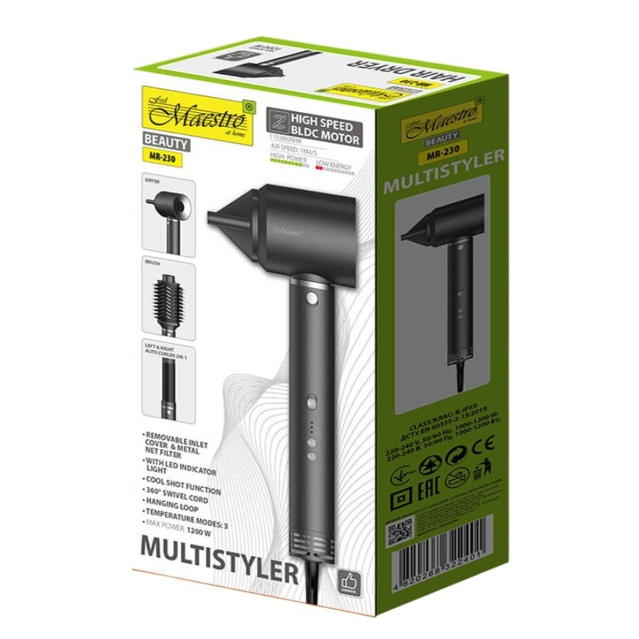 Univerzální multistyler MAESTRO MR-230 kombinuje 3 zařízení v 1 – výkonný fén, tvarovací horkovzdušný kartáč a automatickou kulmu 2v1. S výkonem 1200 W, proudem vzduchu 18 m/s a magnetickými nástavci zajistí rychlé sušení, objem i přirozené vlny. Nechybí BLDC motor 110 000 ot./min, 2 stupně teploty, studený vzduch a otáčivý kabel 360° pro pohodlné použití.