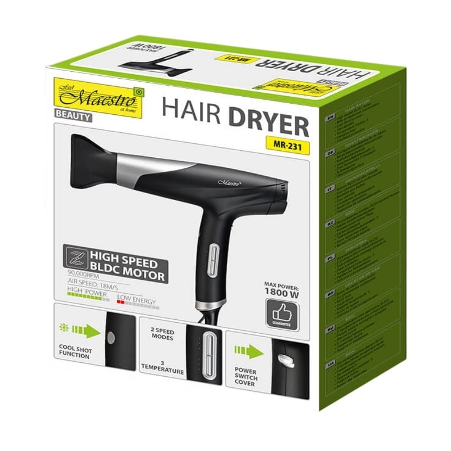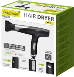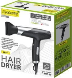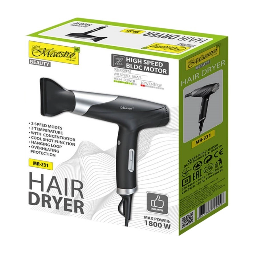 MAESTRO MR-231 je spolehlivý fén navržený pro efektivní každodenní péči o vlasy. Silný výkon 1800 W v kombinaci s BLDC motorem s 90 000 ot./min zaručuje rychlé výsledky i u hustých a dlouhých vlasů. Rychlost proudění 18 m/s zkracuje dobu sušení a pomáhá chránit vlasy před nadměrným teplem.