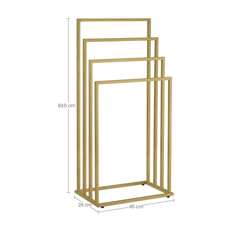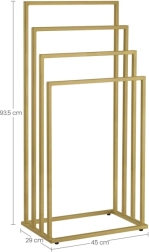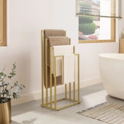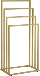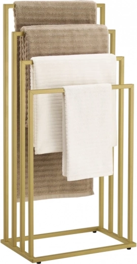 Vneste do koupelny pořádek a styl. Čtyři stupňovitě uspořádaná ramena umožňují cirkulaci vzduchu pro rychlejší schnutí ručníků, županů i plavek. Minimalistický rám v matné zlaté barvě se hodí do moderních i klasických interiérů a šetří místo díky vertikálnímu řešení.