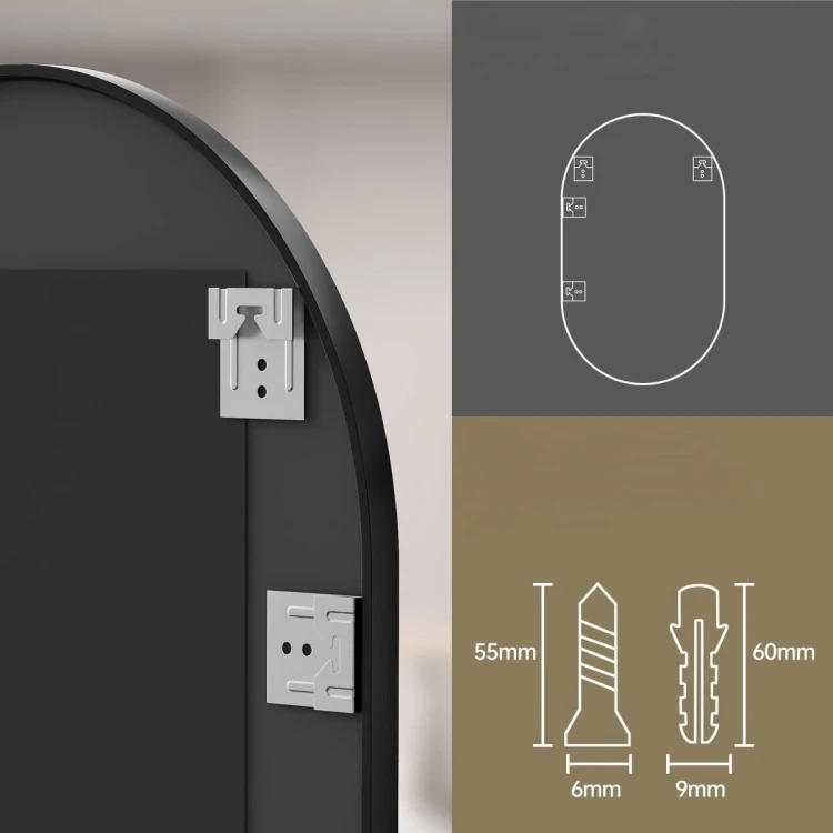 Na zadní straně jsou připravené pevné kovové úchyty pro bezpečné upevnění na stěnu. V balení najdete také montážní sadu, takže zrcadlo jednoduše nainstalujete bez dokupování dalšího příslušenství. Kvalitní 4mm zrcadlové sklo zajišťuje čistý a ostrý odraz.