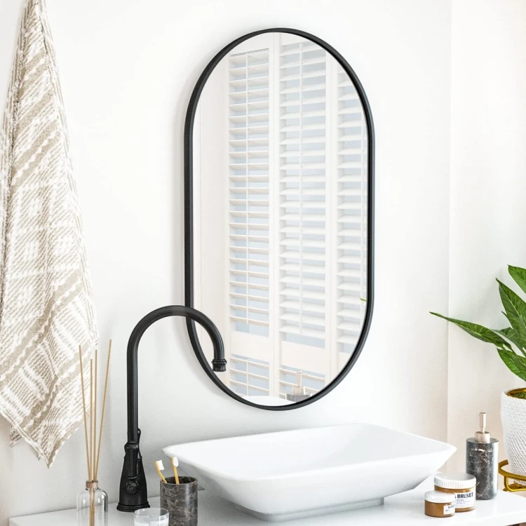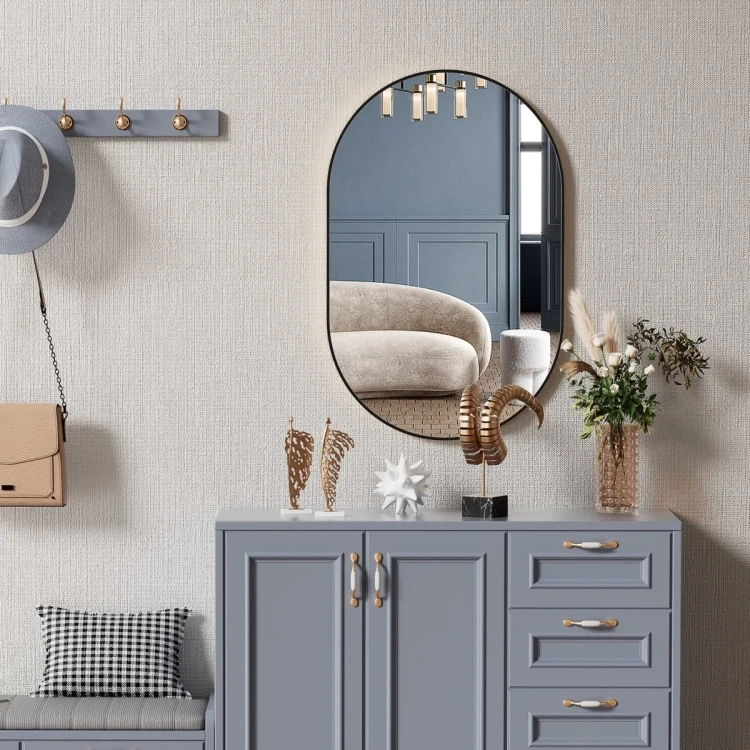 Univerzální oválné zrcadlo je funkční i dekorativní prvek, který prosvětlí prostor a přidá mu na eleganci. Velká odrazná plocha je ideální pro kontrolu outfitu, líčení nebo stylové doladění interiéru. Tenký černý rám z hliníku podtrhuje minimalistický a moderní vzhled, který snadno sladíte s různými typy zařízení.