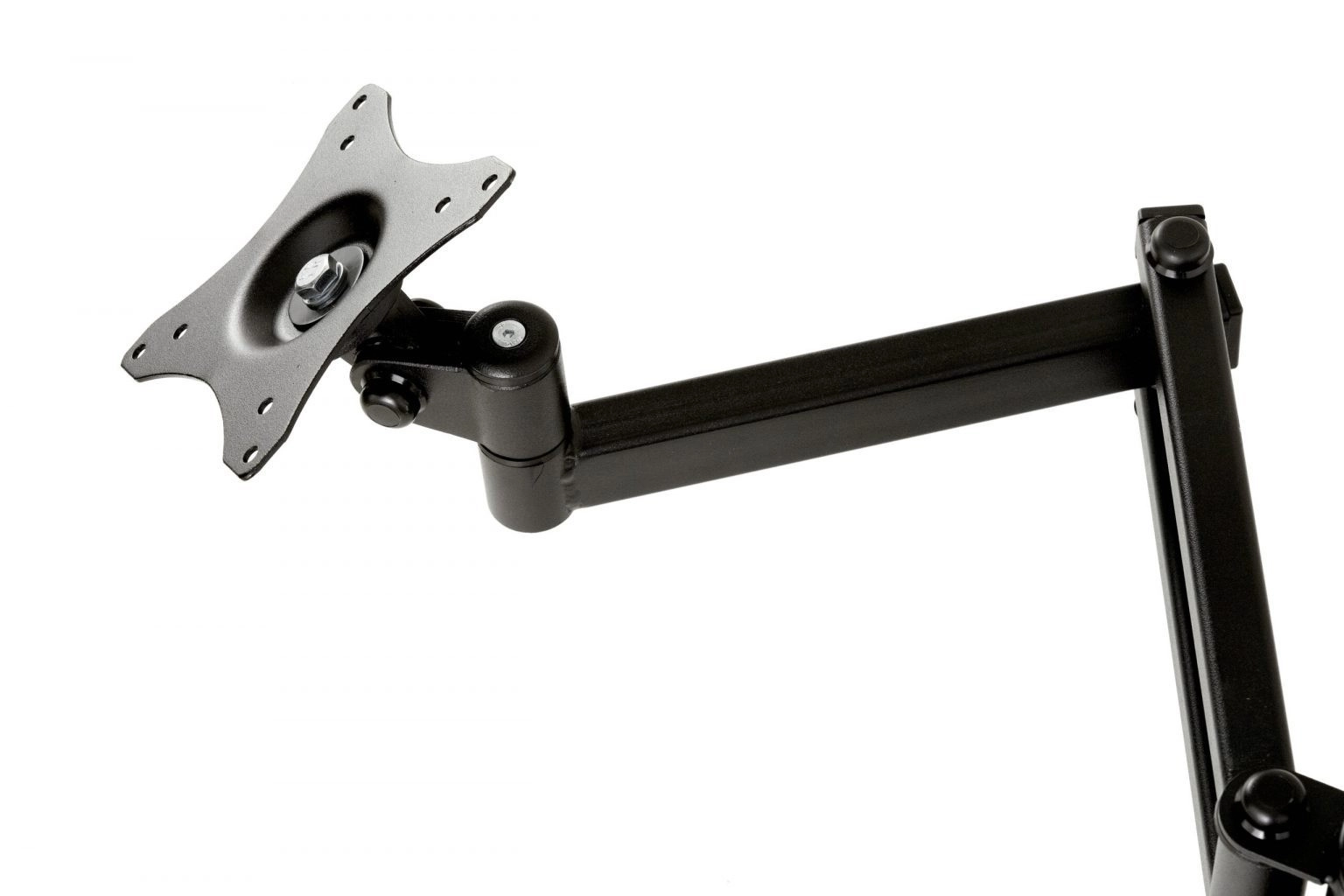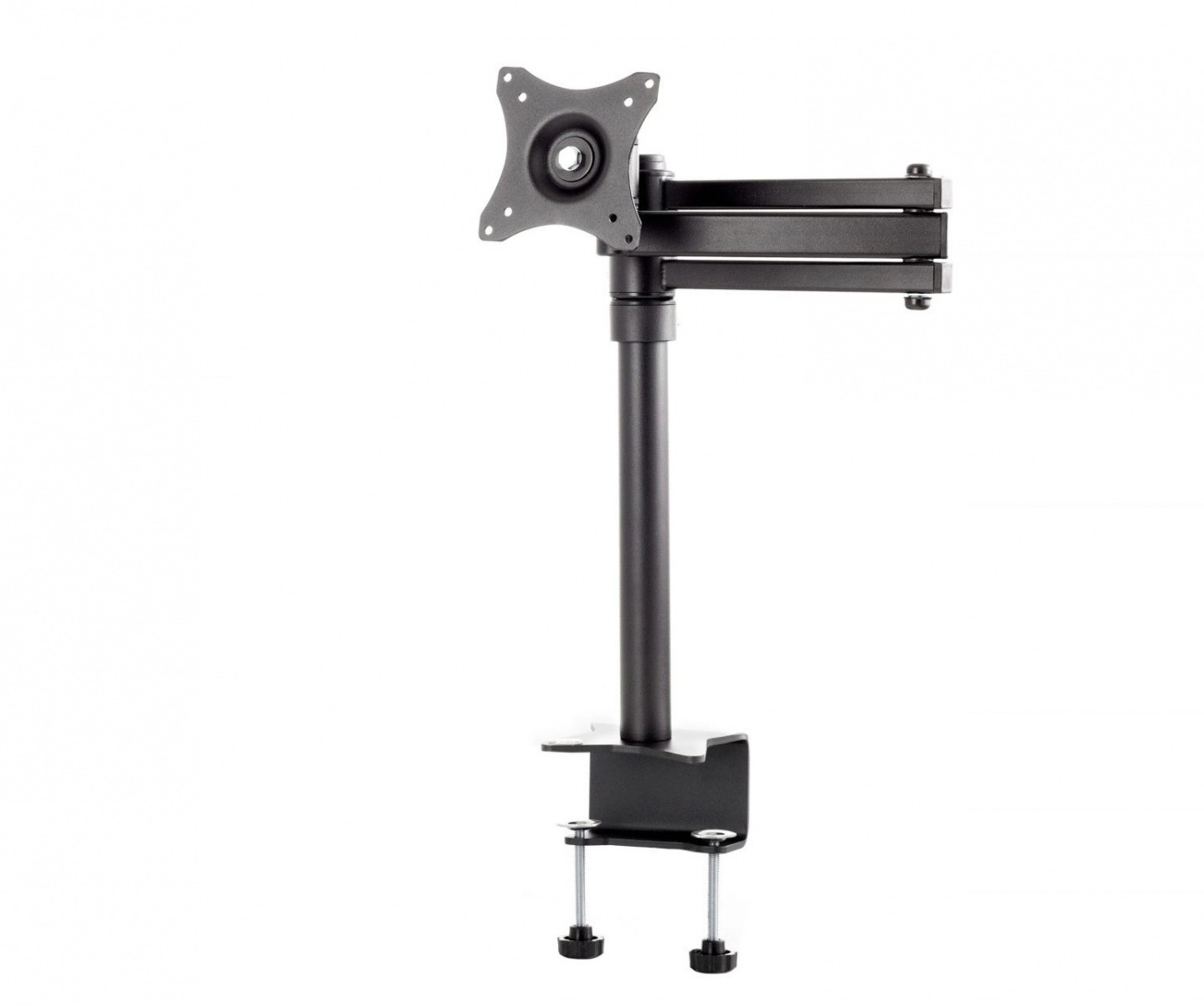 Dvojité rameno s vícenásobnými klouby umožňuje rychlé natočení, vyklopení a vysunutí monitoru. Díky kompatibilitě VESA 75×75 a 100×100 je instalace jednoduchá a rychlá. Součástí je i správa kabelů, která udrží pracoviště přehledné a estetické.