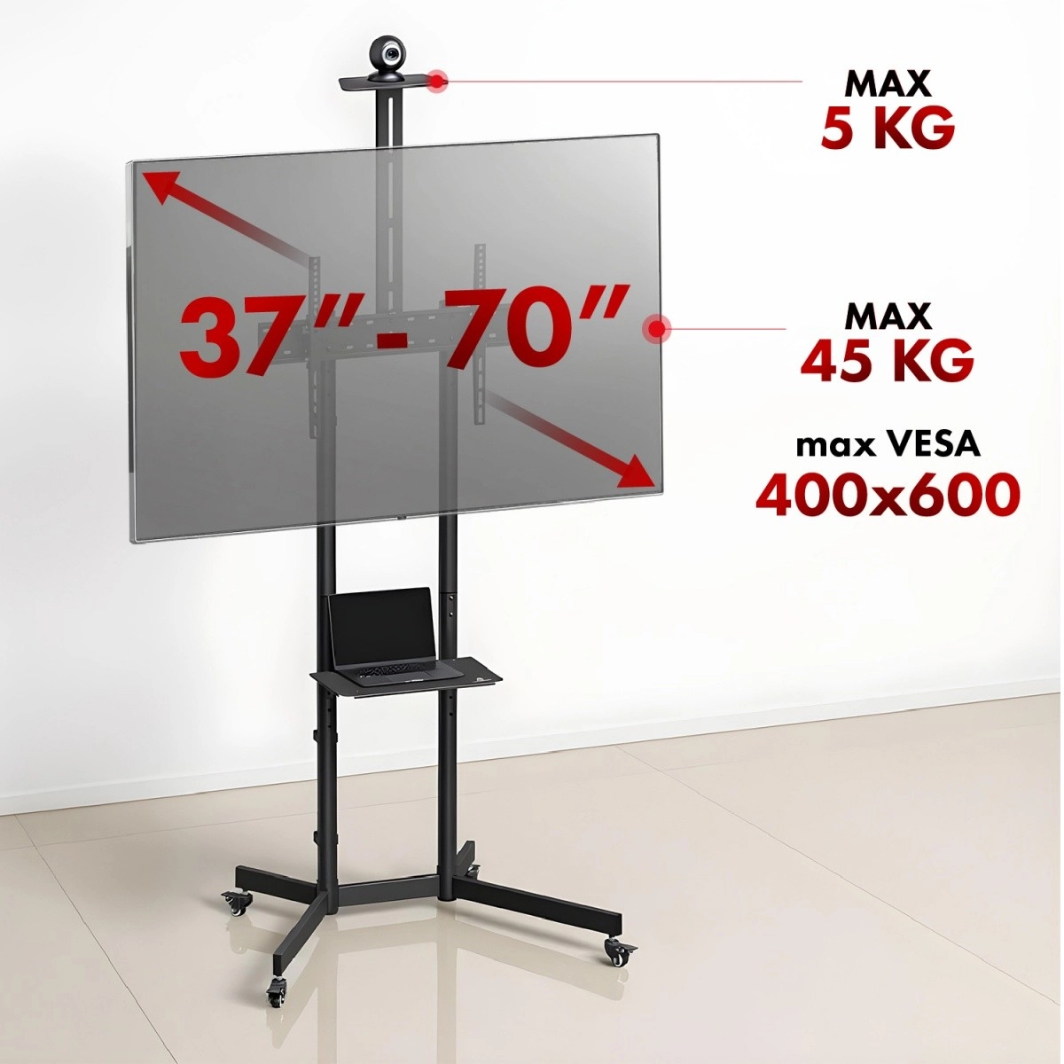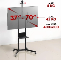 Mobilní TV stojan je ideální pro zasedačky, učebny i domácí použití. Stabilní ocelová konstrukce zajišťuje bezpečné uchycení většiny moderních televizorů do hmotnosti 45 kg. Díky široké kompatibilitě VESA (100×100 až 600×400) snadno připevníte displeje řady značek jako Sony, LG, Samsung či Philips.