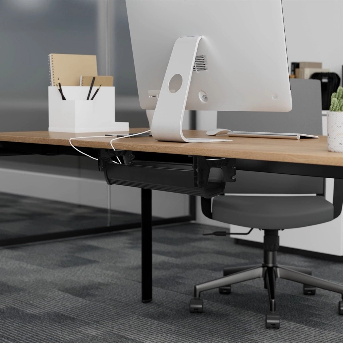 Žlab pod deskou stolu udrží napájecí lištu i kabely mimo dohled, zlepší estetiku a bezpečnost vašeho pracoviště.