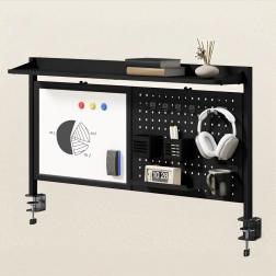 Udržte si pořádek na pracovním stole díky kompaktní nadstavbě s pevnými kovovými svorkami, magnetickou sucho stíratelnou tabulí a perforovaným kovovým panelem pro volné rozmístění příslušenství. Horní úzká police po celé šířce poskytuje další odkládací místo, zatímco háčky, kelímky a polička zajistí, že budete mít vše na dosah ruky bez vrtání do stolu.