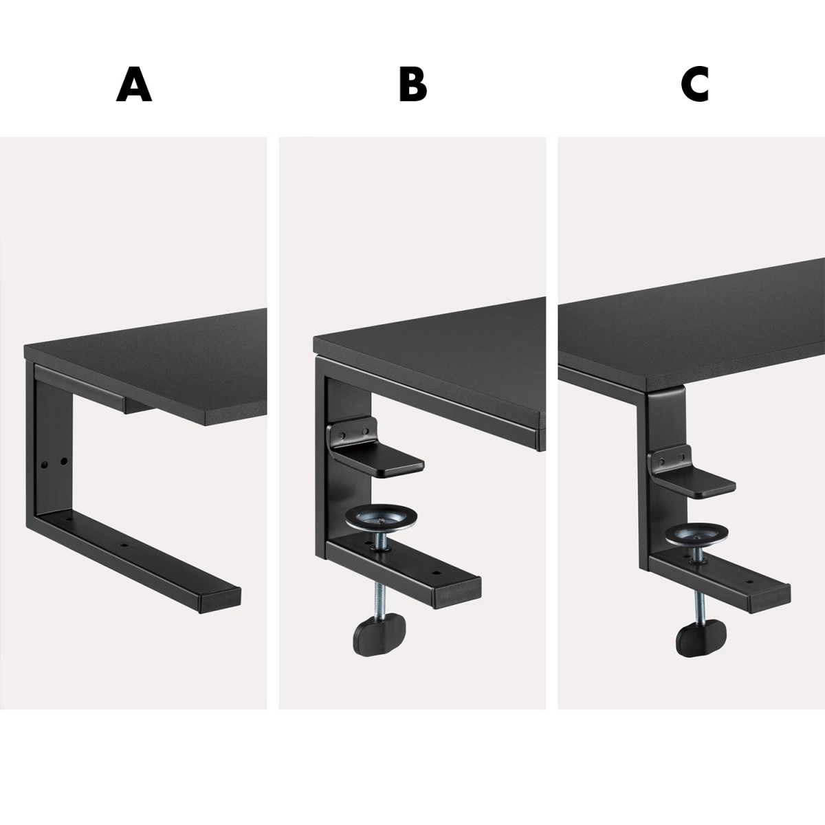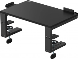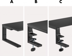 Instalace je rychlá a bez poškození nábytku – dvojice nastavitelných svorek se pevně uchytí k desce stolu (max. tloušťka cca 50 mm), zatímco gumové podložky chrání povrch před poškrábáním. Robustní konstrukce zajišťuje vysokou stabilitu i pro těžší zařízení až do 20 kg.