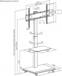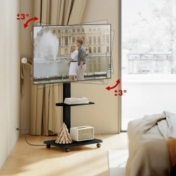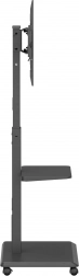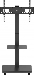 Široká základna s kolečky a aretací umožňuje plynulý přesun mezi místnostmi a bezpečné zajištění na místě. Praktická polička poskytne prostor pro příslušenství, jako jsou přehrávače, set-top boxy nebo prezentační zařízení.