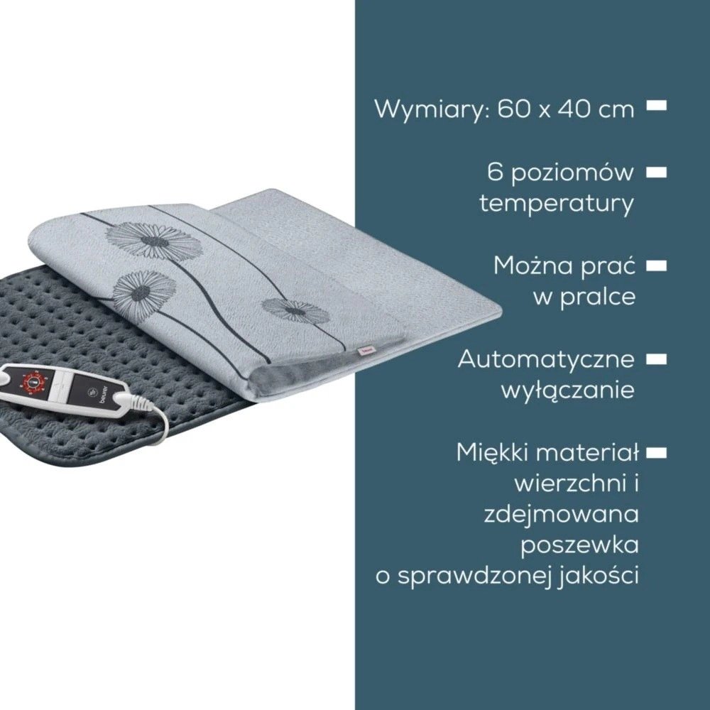 Poduška je vyrobena z hebkého, prodyšného materiálu, který je příjemný na dotek. O vaši bezpečnost se stará Beurer bezpečnostní systém s průběžnou kontrolou teploty a automatickým vypnutím po 90 minutách.