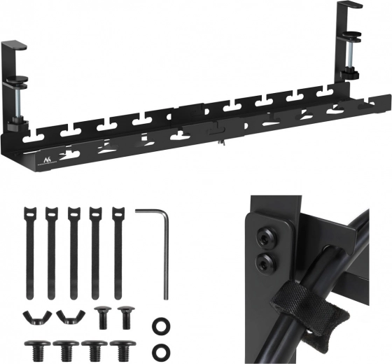 Podstolní organizér na kabely je ideální řešení pro domácí kancelář, herní setup i profesionální pracoviště. Nastavitelná konstrukce v rozsahu 433–728 mm pojme napájecí lištu, napájecí adaptéry i svazky kabelů a díky pevným svorkám jej přichytíte ke hraně stolu bez nářadí a bez vrtání.