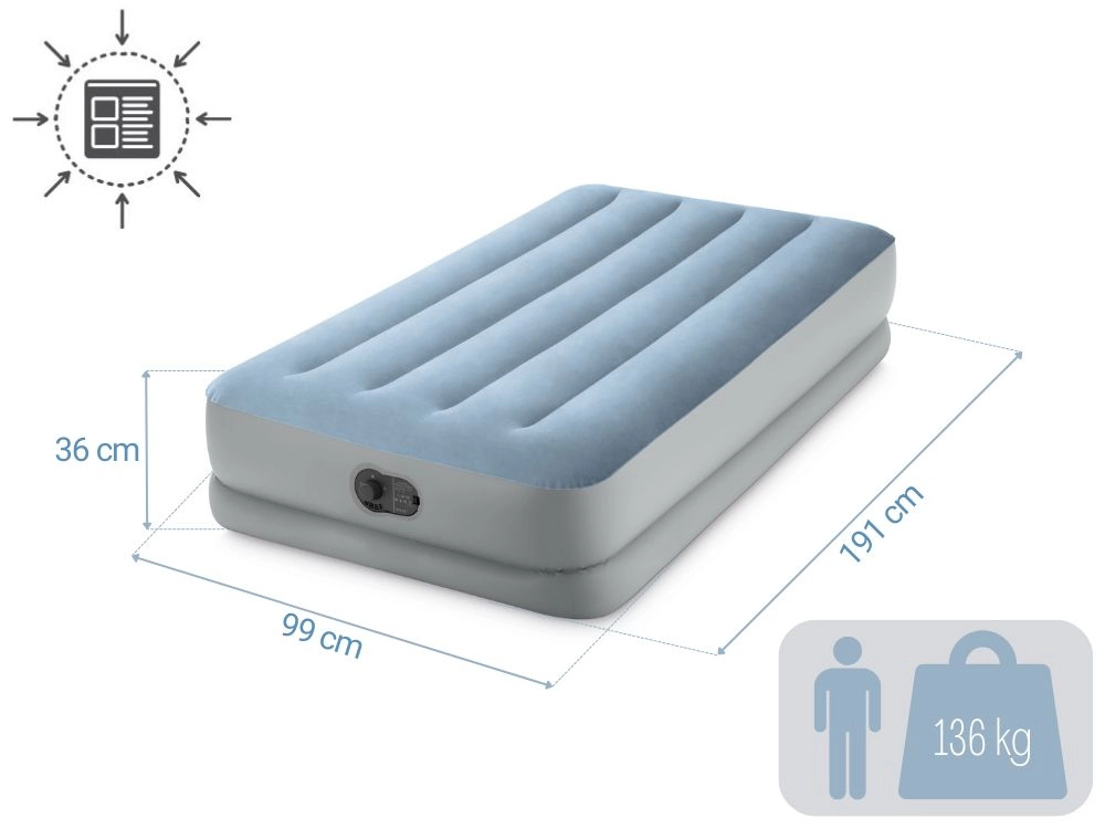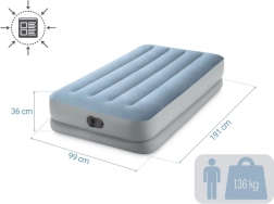 Hledáte pohodlné řešení pro hosty, cestování nebo chatu? Nafukovací matrace Intex kombinuje komfort, stabilitu a mobilitu. Velurový povrch je příjemný na dotek a brání sklouzávání prostěradla, zatímco zesílené komory Fiber-Tech a rám Dura-Beam dodávají lůžku pevnost bez nepříjemného houpání.