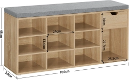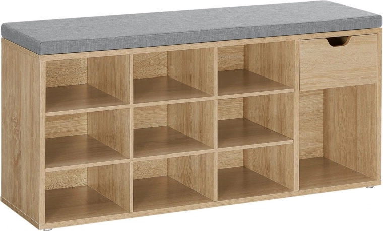 Na horní desce je měkký šedý sedák o tloušťce cca 4,5 cm, který je k tělu skřínky přichycen na suchý zip – snadno jej tak sundáte a vyčistíte. Uvnitř najdete 10 hlubokých polic na obuv až do cca velikosti 44 a praktický prostor pro drobnosti. Každá police unese až 10 kg, celková nosnost skříňky je 200 kg.