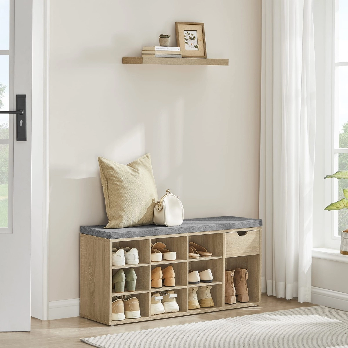 Udělejte pořádek v předsíni, chodbě nebo šatně. Tento botník kombinuje úložný prostor a pohodlné sezení, takže si boty obujete i vyzujete v klidu a bez hledání. Díky univerzální barvě sonoma a čistým liniím se hodí do moderních i klasických interiérů.