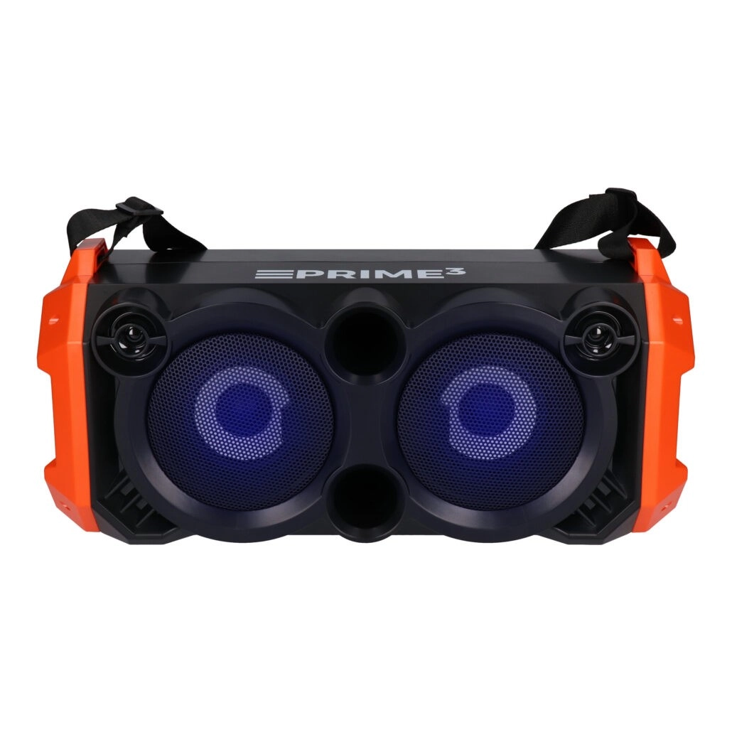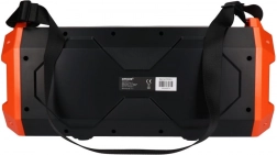 Praktický boční panel s přehledným displejem zajišťuje snadné ovládání. Vestavěná baterie 2000 mAh poskytne až 5 hodin přehrávání a plně se dobije zhruba za 3 hodiny. Součástí je ramenní popruh pro pohodlné nošení. Odolné černé provedení s oranžovými akcenty působí stylově a moderně.