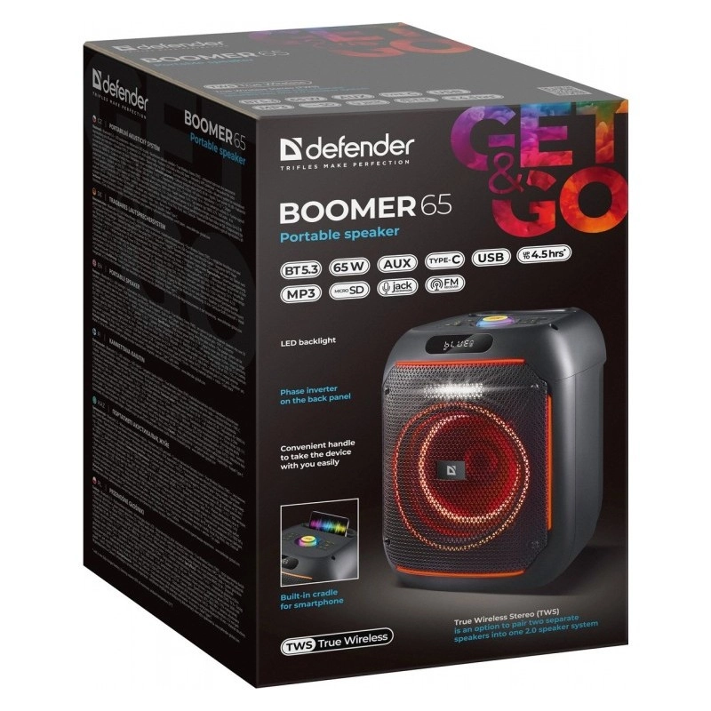 BOOMER 65W je výkonný party reproduktor, který spojuje silný zvuk, praktické funkce a atraktivní světelné efekty. Díky Bluetooth 5.3 přehrává hudbu bez výpadků a s nízkou latencí, zatímco vestavěný MP3 přehrávač a FM rádio rozšiřují možnosti poslechu i bez telefonu.