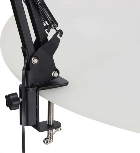 V balení najdete jak stabilní kruhovou základnu, tak svěrné uchycení na hranu desky (max. 5 cm). Zvolte řešení, které vyhovuje vašemu pracovnímu prostoru – na stole nebo ušetřením místa pomocí svorky.