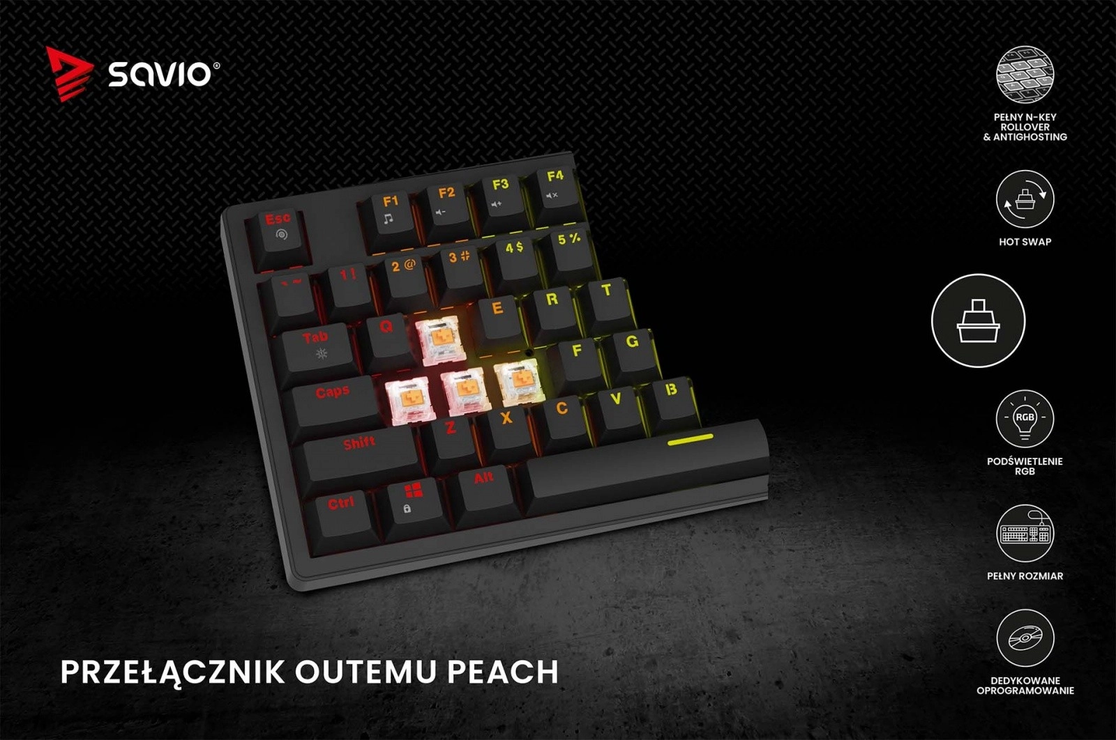 Savio STYX je plnohodnotná mechanická klávesnice navržená pro hráče i náročné profesionály. Tiché lineární spínače OUTEMU PEACH SILENT se zabudovanými tlumiči zajišťují hladký stisk, minimální hlučnost a komfort i při dlouhém psaní či nočním hraní. Díky hot‑swap paticím snadno vyměníte spínače bez pájení a přizpůsobíte si odezvu přesně svým preferencím.