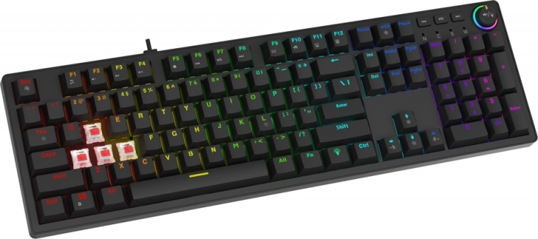 Plná velikost s numerickým blokem a multimediálními klávesami poskytuje maximální funkčnost v práci i při zábavě. Praktické multifunkční kolečko usnadní rychlé nastavení hlasitosti a intenzity podsvícení bez složitých zkratek. Odolné ABS keycapy, pletený kabel USB-A/USB-C a přiložené nástroje pro výměnu kláves a spínačů doplňují promyšlenou výbavu.