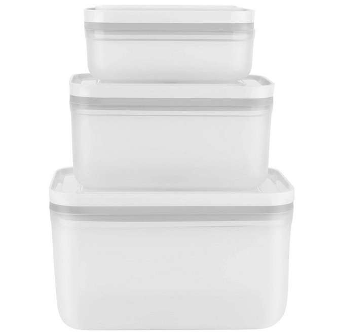 Sada tří kompaktních dóz Fresh & Save (velikost S) je navržená pro každodenní skladování potravin. Víko s centrálním vakuovým ventilem a těsnicím kroužkem minimalizuje přístup vzduchu, čímž pomáhá prodloužit čerstvost a omezit plýtvání jídlem.