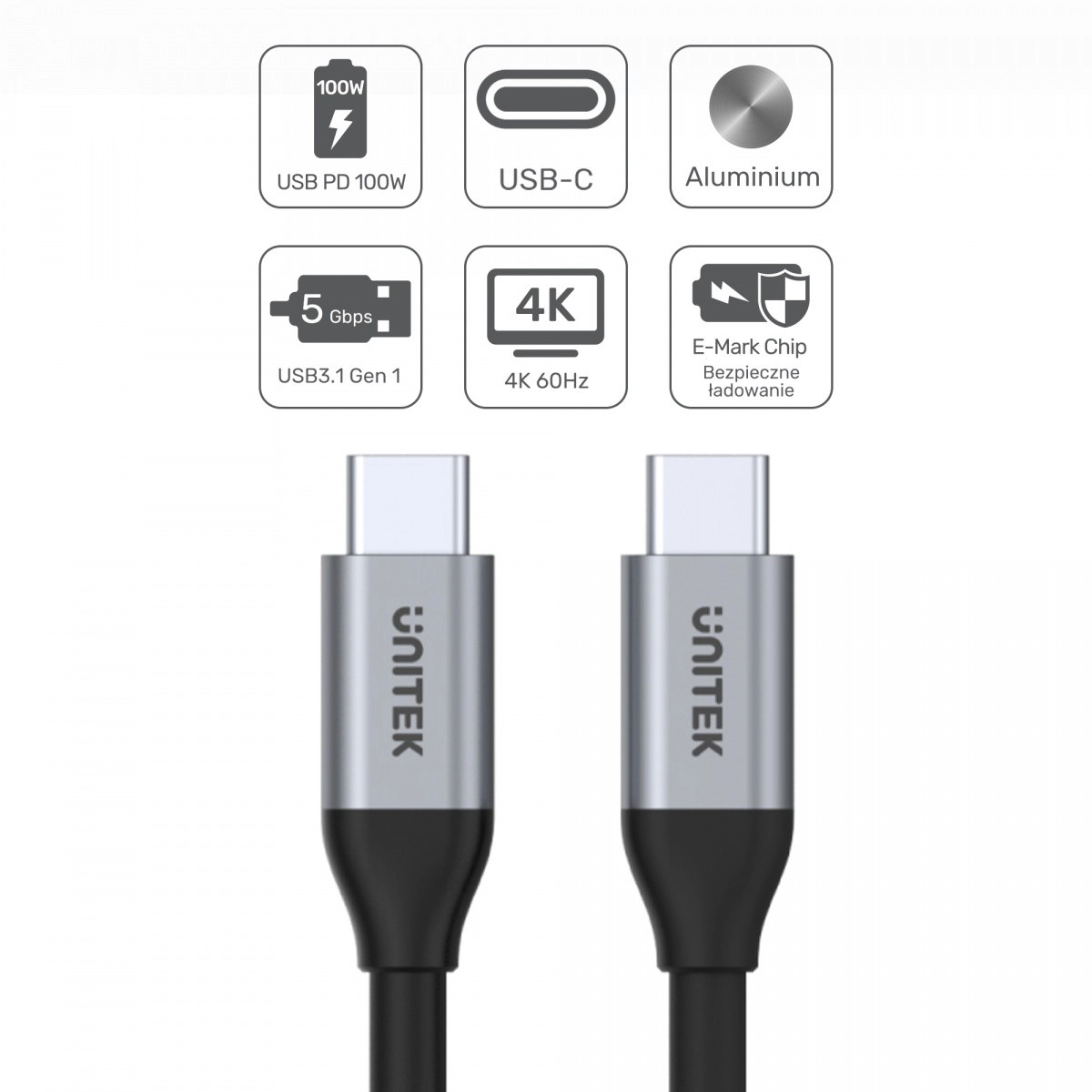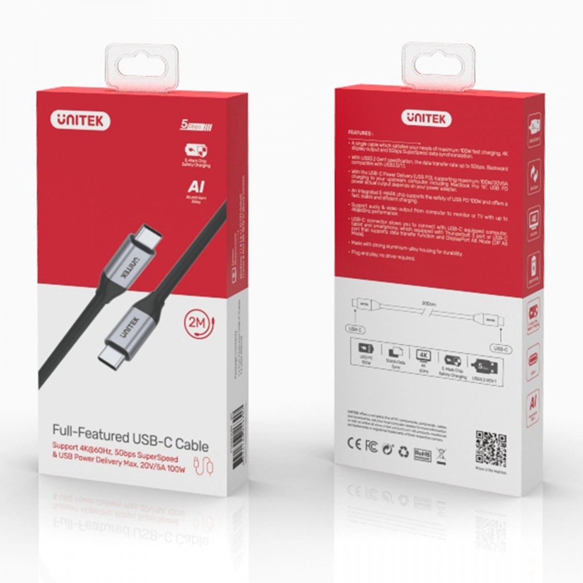 Univerzální kabel USB‑C ↔ USB‑C o délce 2 m pro rychlý přenos dat, obraz i napájení. Nabízí až 100 W Power Delivery, přenos dat 5 Gbps (USB 3.1 Gen 1) a video až 4K při 60 Hz. Díky E‑MARK čipu a hliníkovým konektorům je připojení rychlé, stabilní a bezpečné.