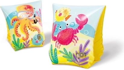 Rukávky mají hravé ilustrace medúz, chobotnice a krabů v zářivých barvách na žlutém pozadí, což děti povzbuzuje k plavání.