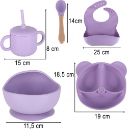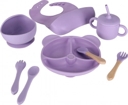 Kompletní silikonová jídelní sada pro děti v elegantní fialové barvě usnadní první krůčky k samostatnému stolování. Obsahuje vše potřebné: dělěný talíř s přísavkou, misku s přísavkou, učící hrneček s víčkem a brčkem, 2 lžičky a 2 vidličky a nastavitelný bryndák s kapsou. Vyrobeno z bezpečného silikonu bez BPA, vhodné do myčky i mikrovlnné trouby.