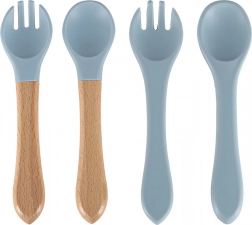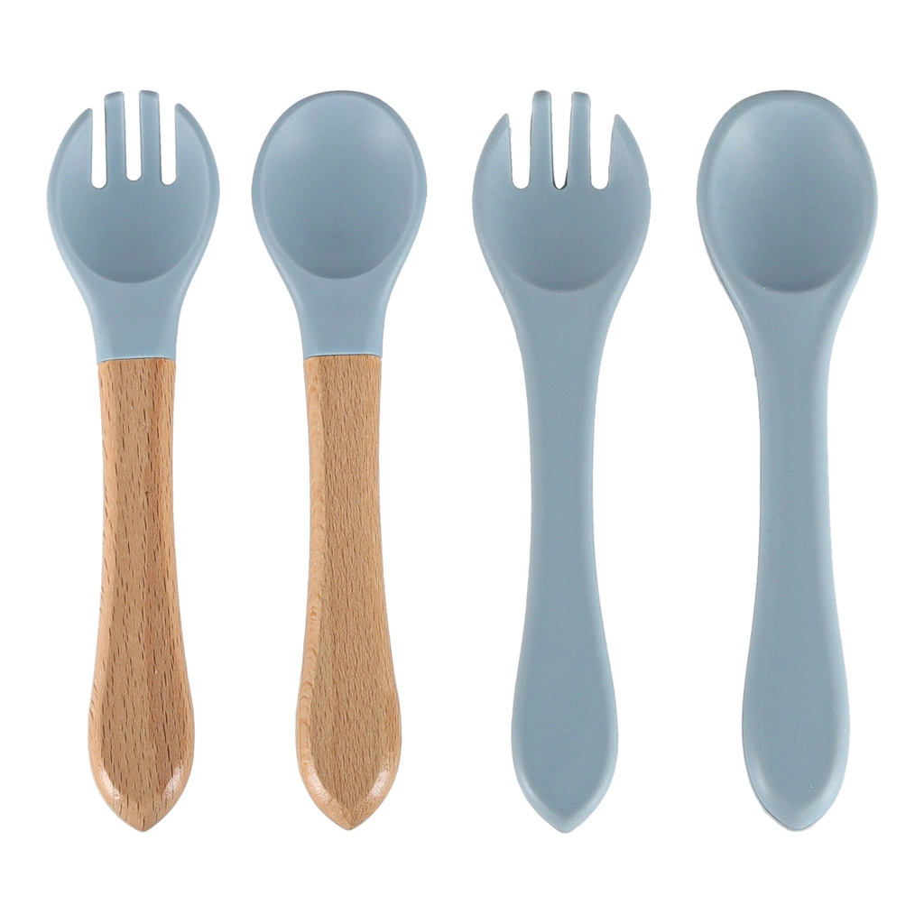 Nastavitelný silikonový bryndák s hlubokou kapsou zachytí většinu zbytků a chrání oblečení. Dvě sady příborů (silikonové a s dřevěnou rukojetí) podpoří různé fáze učení držení a nabírání. Hrnek s víčkem a brčkem pomáhá trénovat samostatné pití bez zbytečných rozlití.