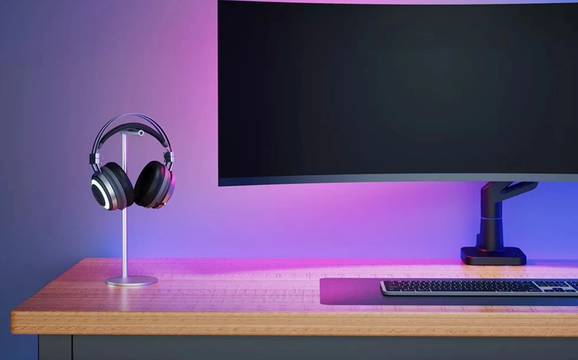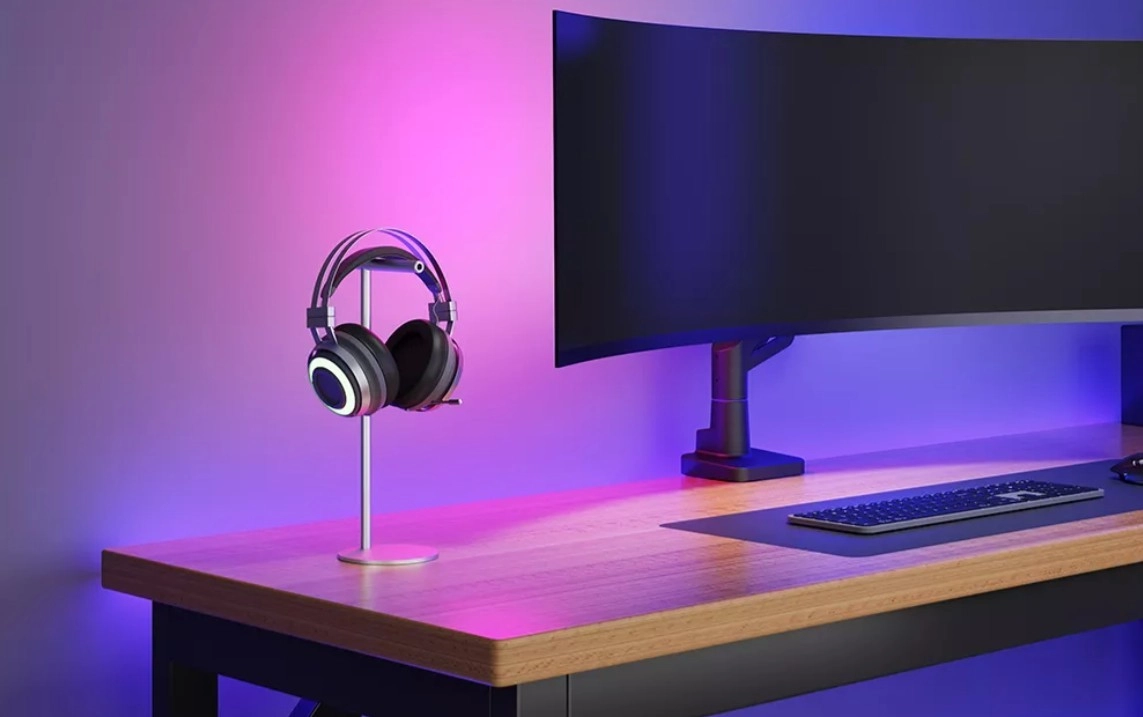 Štíhlý sloupek a krátké rameno udrží sluchátka přehledně nad deskou, takže získáte více volného prostoru pro práci i hraní.