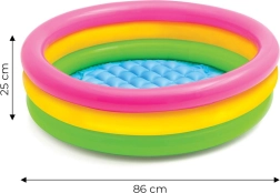 Nafukovací bazének INTEX přináší dětem radost z vodních hrátek přímo na vaší zahradě. Díky kompaktním rozměrům 86 × 25 cm se vejde téměř kamkoli a nízká hladina vody 17 cm zvyšuje pocit bezpečí pro nejmenší. Duhové barevné provedení je poutavé a láká ke hře.