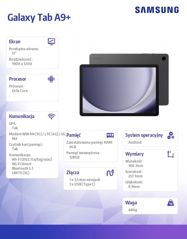 Stylový tablet Samsung Galaxy Tab A9+ nabízí velký displej pro zábavu i práci, rychlé Wi‑Fi připojení, solidní výkon a 128 GB úložiště v tenkém a lehkém těle. Ideální pro filmy, hry, prohlížení webu i učení na cestách.