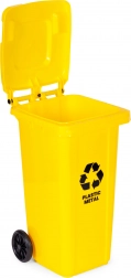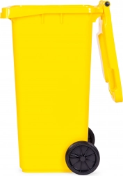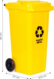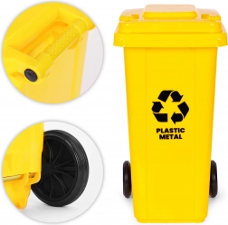 Odolná žlutá popelnice o objemu 120 l pro třídění plastu a kovu. Vyrobena z HDPE odolného vůči UV, s gumovými koly, ergonomickými madly, stabilizačními nožkami a těsným víkem. Kompatibilní s komunálními systémy EN 840, ideální pro domácnosti i firmy.