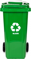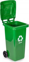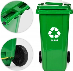 Praktický a odolný kontejner na třídění skla s objemem 120 l z HDPE odolného vůči UV, chemikáliím a mechanickému poškození. Gumová kola a ergonomické madlo zajišťují snadnou manipulaci, těsnící víko chrání před deštěm a zápachem. Stabilitu na kluzkém povrchu zvyšují protiskluzové nožky. Vhodné pro domácnosti i firmy, kompatibilní s komunálním svozem dle EN 840 a certifikované ISO9001, ISO14001, ISO45001.
