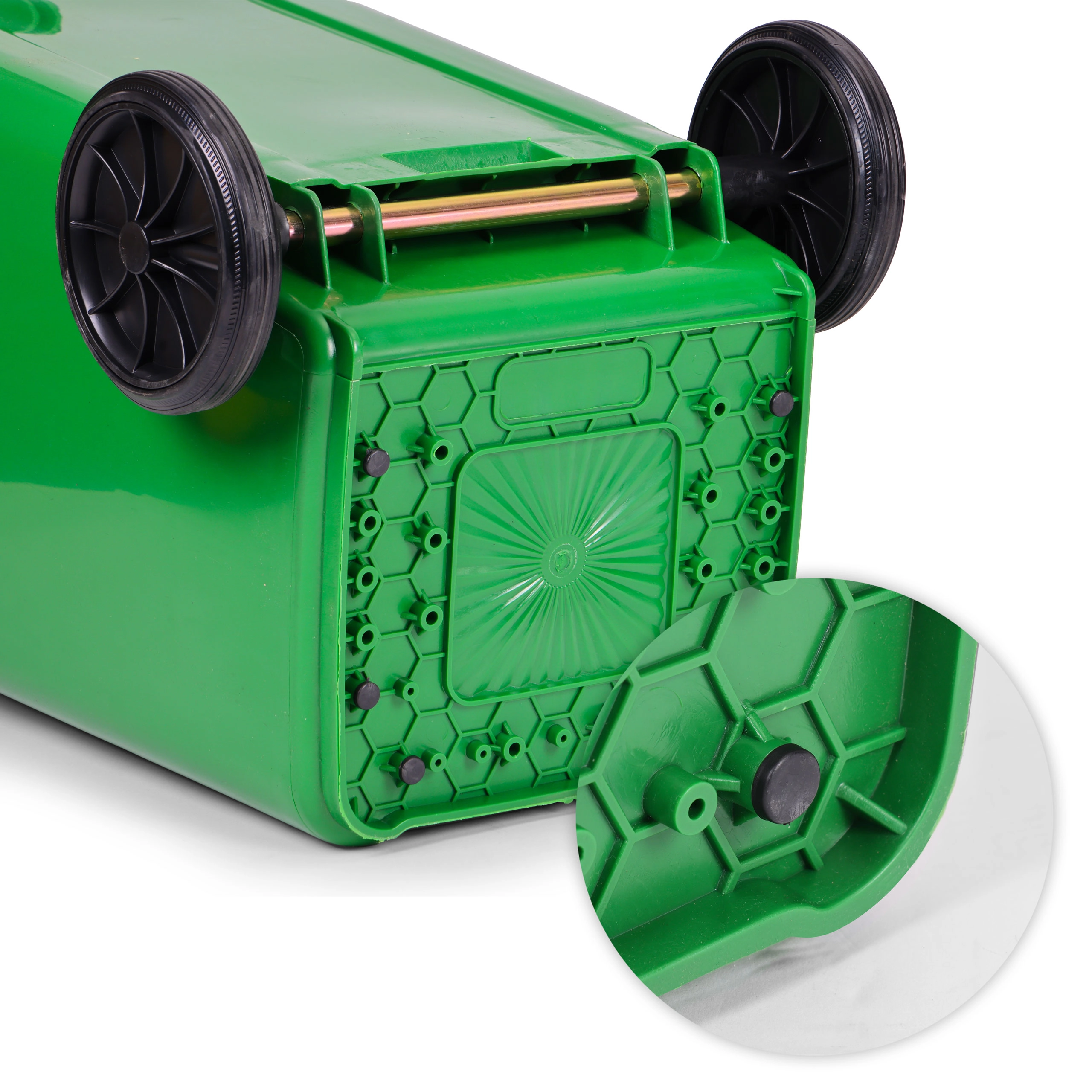 Pro pohodlné přemisťování slouží gumová kola na kovové ose a ergonomická madla s protiskluzovým profilem. Stabilizační nožky omezují posun po mokrém povrchu a chrání podlahu před poškrábáním. Nádoba je plně kompatibilní s komunálními vozy dle EN 840, a díky normám ISO9001, ISO14001, ISO45001 splňuje náročné požadavky na kvalitu a bezpečnost.