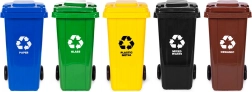 Kompletní sada pěti košů o objemu 5×120 l pro přehledné třídění odpadu: papír, sklo, plast/kov, směsný, bio. Odolné tělo z HDPE, gumová kola na kovové ose, ergonomická madla a stabilizační protiskluzové patky. Víka jsou těsně uzavíratelná, nádoby splňují EN 840 a standardy ISO9001/14001/45001 – ideální pro domácnosti, firmy i provozy.