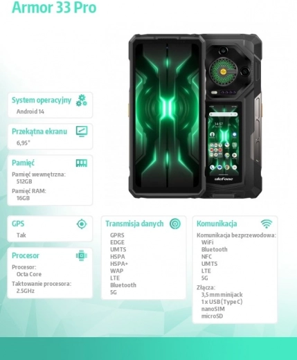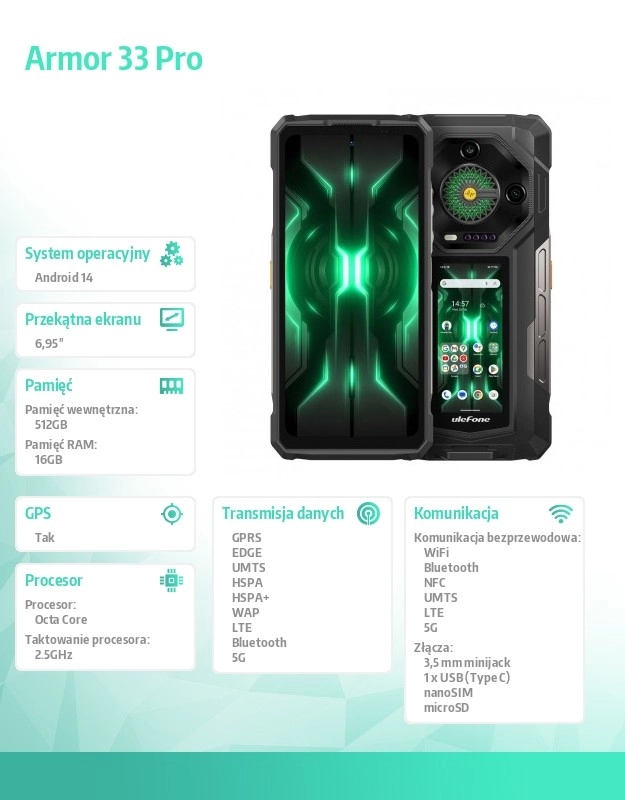 Monstrózní 25 500 mAh baterie zvládne dny bez nabíjení, podpora 66 W zkrátí doplňování energie a 10 W reverzní nabíjení oživí vaše další zařízení. S certifikací IP68/IP69K a MIL‑STD‑810H se Armor 33 Pro nezalekne vody, prachu ani nárazů. Samozřejmostí je 5G, Wi‑Fi 6, Bluetooth 5.4, NFC, přesná navigace a praktický 3,5 mm jack i USB‑C.