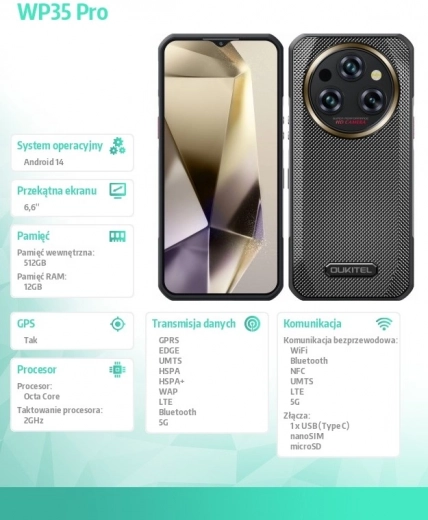 Hledáte telefon, který zvládne mokro, prach i nárazy? OUKITEL WP35 Pro 5G spojuje robustní konstrukci s moderním výkonem a bohatou výbavou. Osmijádrový čipset MediaTek Dimensity 6300 zajišťuje plynulý chod Androidu 14, hry i práci v terénu. Paměť 12 GB RAM lze rozšířit virtuálně až na 36 GB, takže multitasking běží bez kompromisů. Velké 512GB úložiště doplníte microSD kartou až o 2 TB.