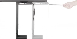 Otočný a výsuvný mechanismus usnadňuje přístup k portům a údržbě, zatímco rychloupínací páka dovoluje rychlé nastavení a uzamčení správné polohy. Umístění PC pod desku zároveň minimalizuje usazování prachu a zlepšuje cirkulaci v pracovním prostoru.