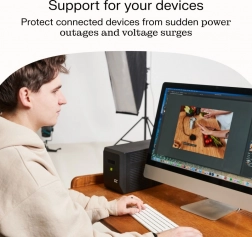 Integrované ochrany, včetně RJ45 proti přepětí pro síťové prvky (router, modem, notebook), doplňuje správcovská aplikace pro snadné sledování a kontrolu UPS. Díky tomu udržíte svou práci v bezpečí a zařízení v chodu i během nepravidelností v napájení.