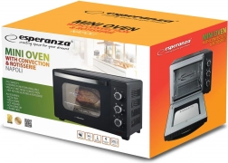 Mini trouba ESPERANZA Napoli spojuje kompaktní rozměry s maximálním výkonem pro každodenní vaření i pečení. Cirkulace horkého vzduchu zajišťuje rovnoměrné rozprostření tepla, rožeň je ideální pro šťavnaté kuře a pečeně a pět pracovních režimů pokryje vše od křupavé pizzy po zapékané pokrmy. Dvojité sklo dveří s vzduchovou mezerou zlepšuje tepelnou izolaci a bezpečnost.