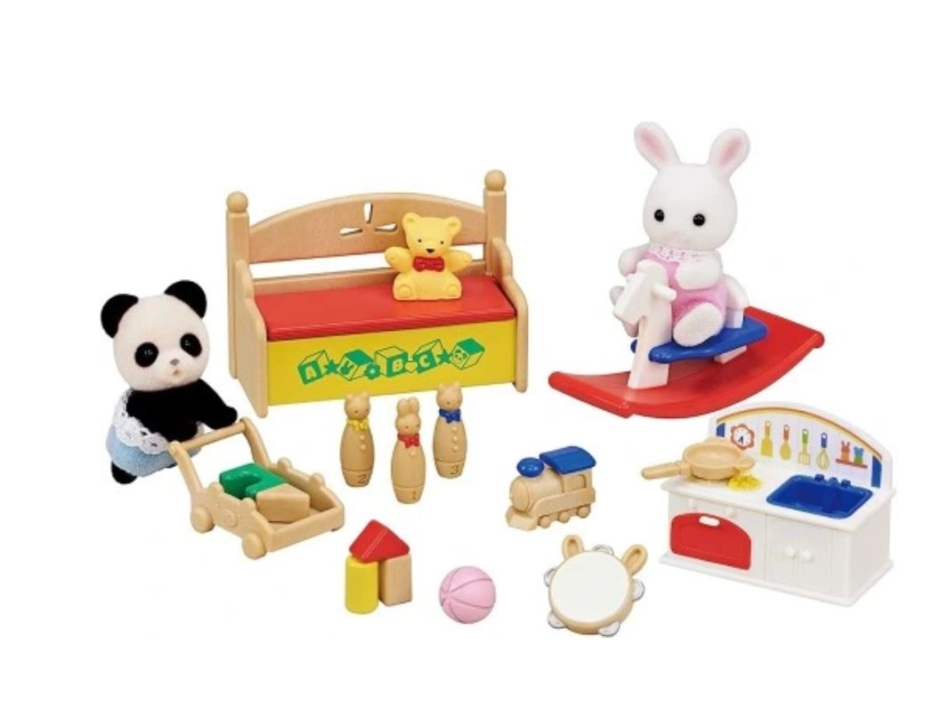 Součástí jsou rozmanité doplňky pro hraní na školku i domácnost: houpačka v podobě houpacího koníka, stavební kostičky, kuželky, tamburína a kuchyňka se dřezem. Nechybí lavička s truhlou na hračky pro uklizení po hře. Každý prvek je vyroben s důrazem na kvalitu a bezpečnost, typickou pro SYLVANIAN FAMILIES.